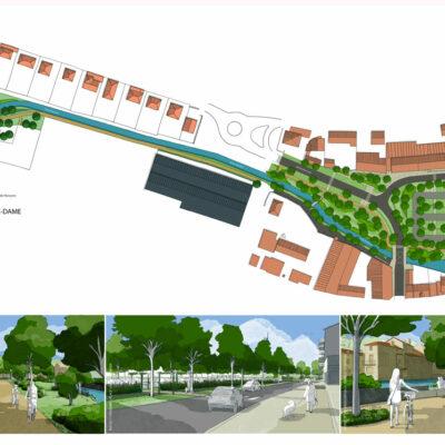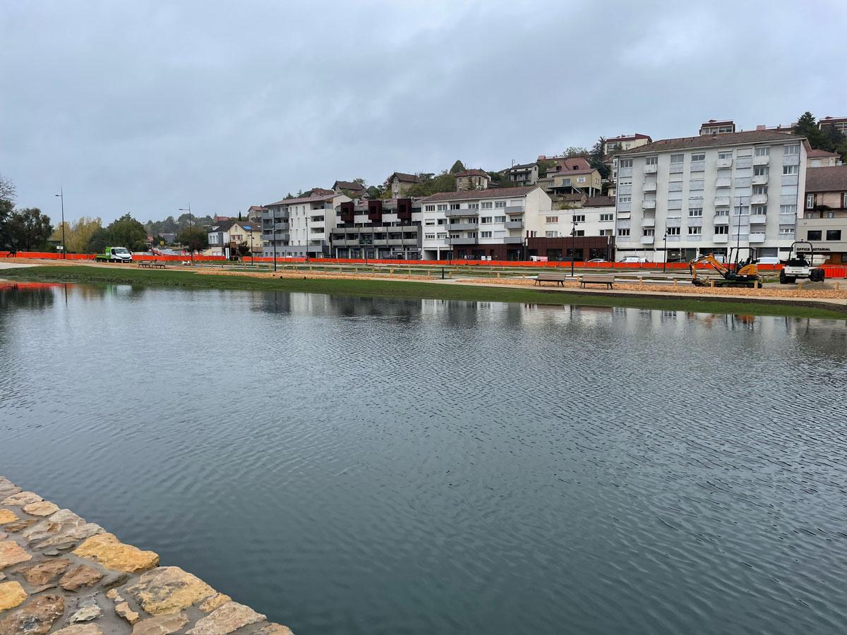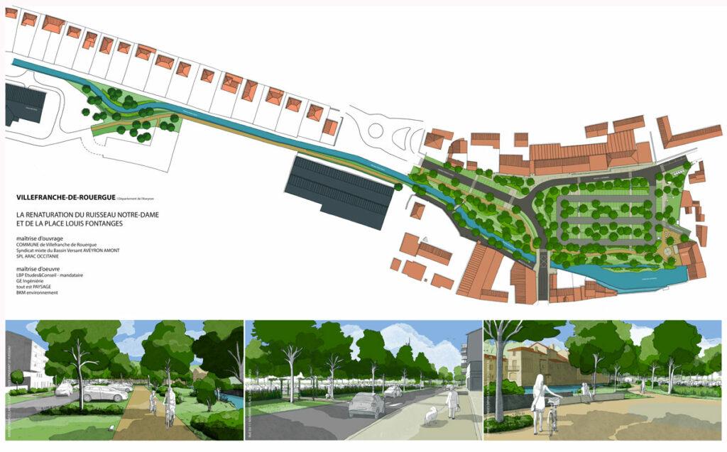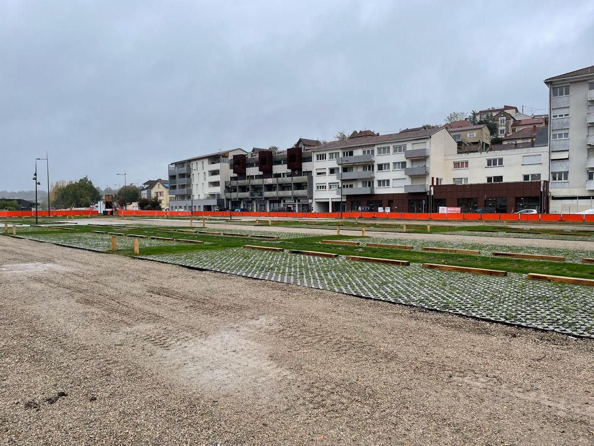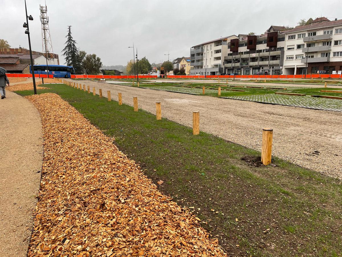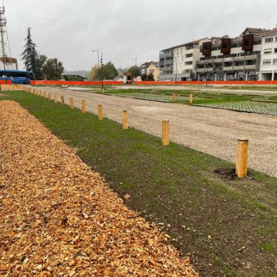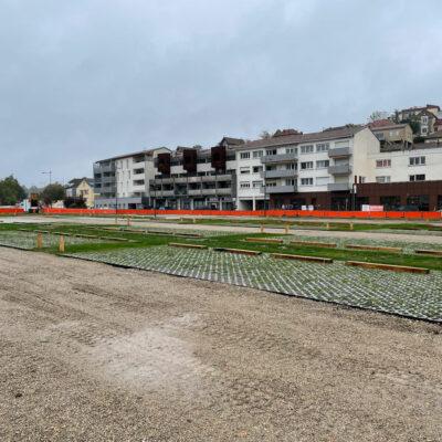 Toujours à Villefranche, la visite s’est poursuivie avec le chantier de la place Louis Fontanges. Cet aménagement prévoit la transformation d’un vaste parking bitumé de 11 000 m² en un parc arboré, où le stationnement sera maintenu sur un revêtement perméable.